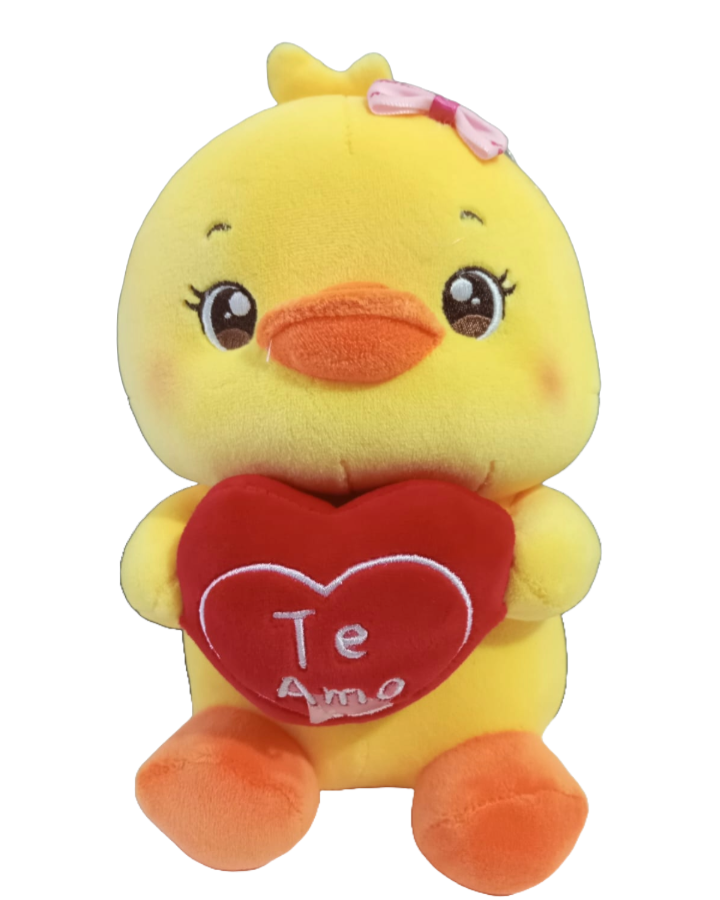 Pollito amarillo de dulces ojos con un corazón que en letras bordadas dice: "TE AMO". Mide 22 cm de altura. Es muuy lindo!!