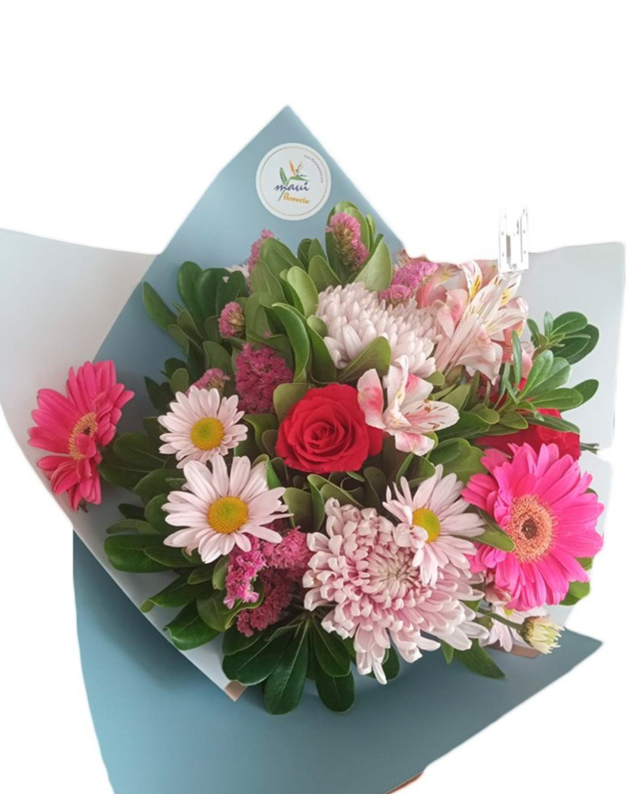 Bouquet de rosas, gerberas, alstroemerias, margaritas y roxanas en matices fiucsa, blanco y lila con follajes finos envuelto en papel decorativo.