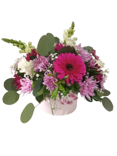 Hermosa caja con Gerberas, Crisantemo, Rosas, perrito y follaje que lo hacen destacar desde que lo ves. Una excelente opción para regalar.