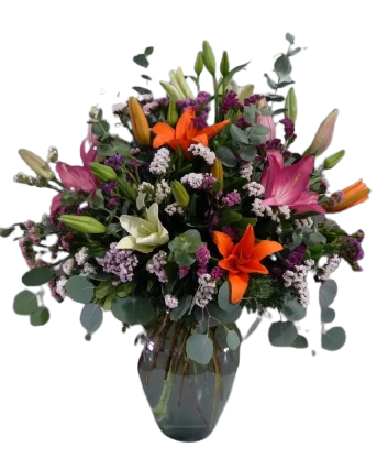Hermoso e impactante arreglo de diversas flores resaltando las Lilis y el hermoso follaje a su alrededor. Encantador e ideal para conquistar y demostrar cariño. HERMOSO