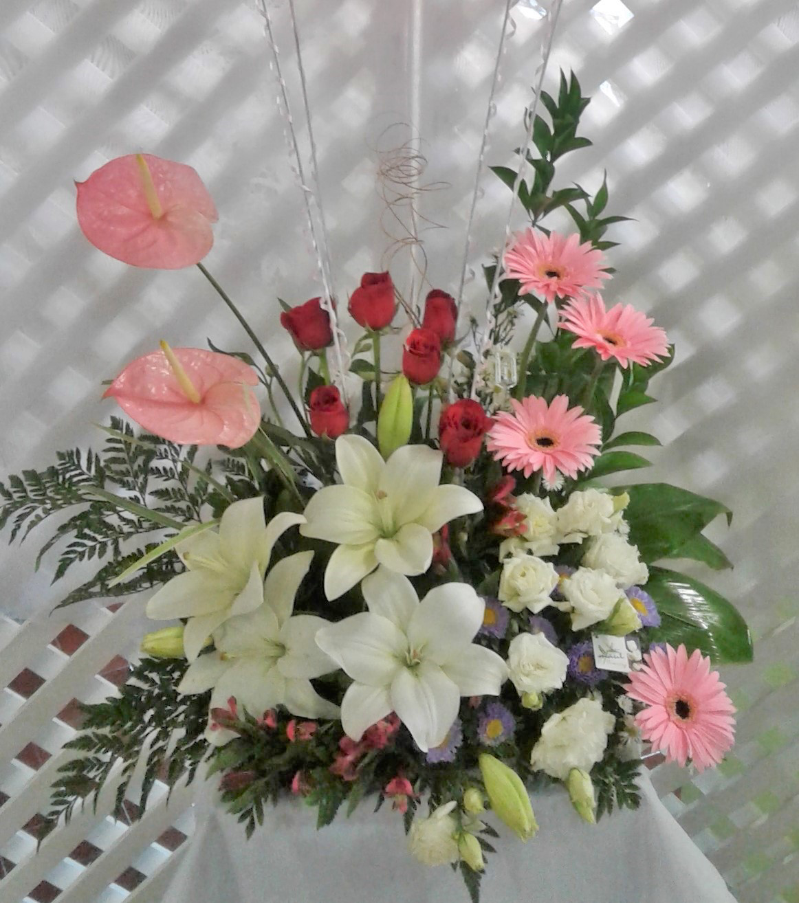 Tierno arreglo de una sola vista elaborado en colores pastel con Rosas, Gerberas, Lilies, Alstroemerias y Anturios acompañados de follajes y varas.